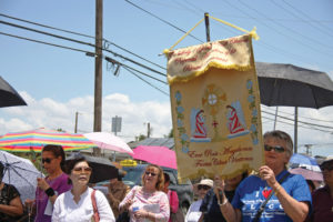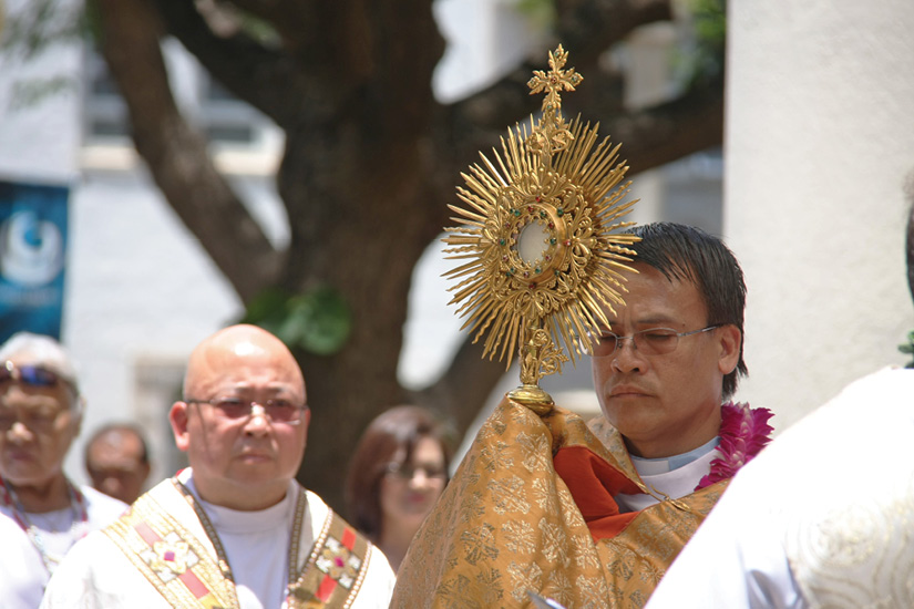 Passersby on the highways and byways leading from the Co-Cathedral of St. Theresa to the Cathedral Basilica of Our Lady of Peace in the heart of Honolulu were blessed with prayers and hymns by marching faithful as Bishop Larry Silva led the diocese’s annual Eucharistic Procession on May 29.