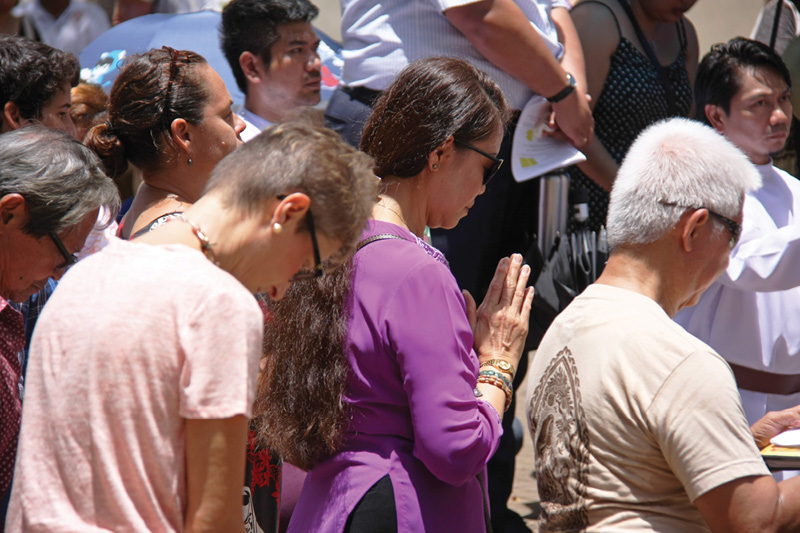 - Faithful pray in front of the Cathedral Basilica of Our Lady of Peace as the procession culminates.