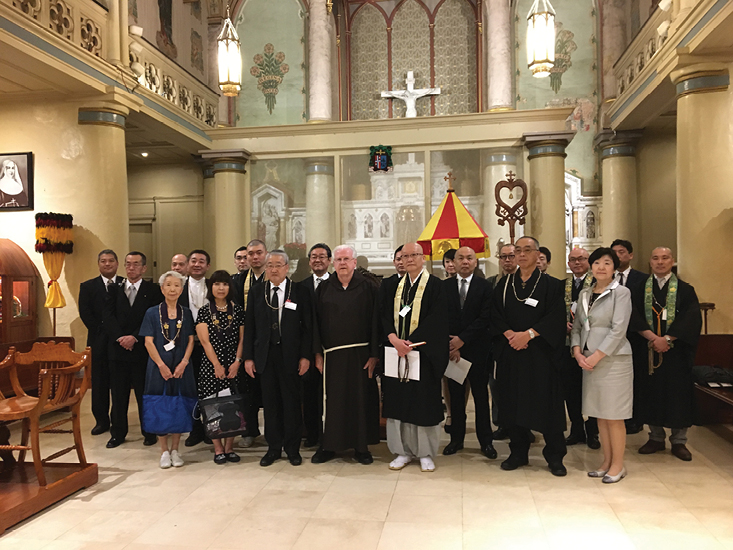 Members of the Japanese Religious Committee for the World Federation came to Hawaii earlier this month to attend memorial services for the 75th anniversary of the bombing of Pearl Harbor. The group, based out of Kyoto, Japan, took time during their stay in the Islands to tour the Cathedral Basilica of Our Lady of Peace, Dec. 6. Capuchin Franciscan Father Gordon Combs led the tour of the church for the visiting delegation, which included Shinto and Catholic priests, Buddhist monks and faithful of other Christian denominations. (Photo courtesy Michiko Wada, Japanese Catholic Community)