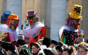 Clowns are seen in St. Peter’s Square during the annual parade marking the feast of the Epiphany at the Vatican Jan. 6.