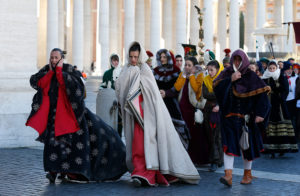 People in traditional attire endure cold weather during the annual parade marking the feast of the Epiphany in St. Peter’s Square.