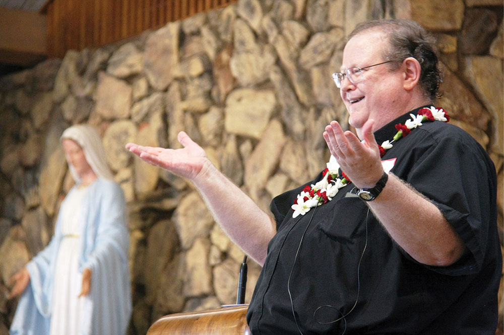 Father Andrew Kemberling, chairman of the International Catholic Stewardship Council, opens his keynote address at the diocese’s annual Stewardship Day, Jan. 28, with a warm greeting for the participants gathered at Mary, Star of the Sea Church in Waialae-Kahala. Stewardship Day featured several workshops and discussions on communication, pastoral and estate planning, data management and financial services, and other topics for parishioners and clergy to create a culture of giving time, talent and treasure in the diocese. (HCH photo | Darlene Dela Cruz)