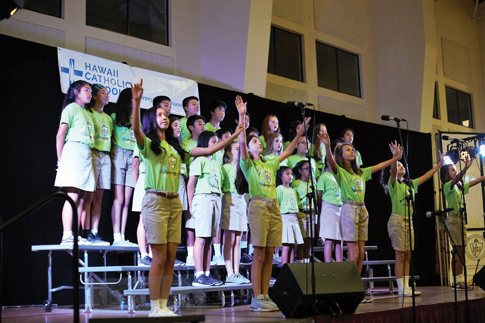 Students from Holy Family Catholic Academy were among a dozen performing groups at the 5th Annual Hawaii Catholic Schools Choral Festival, March 2 at the Clarence T.C. Ching Gymnasium in the Maryknoll Community Center. The theme of this year’s festival was “Ode to Mary.” (Photo courtesy Deborah Manog and Hawaii Catholic Schools office)