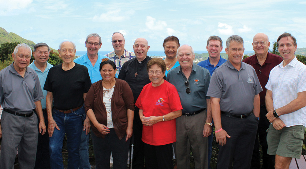 Bishop Larry Silva met with the Serra Club of Honolulu March 8 at St. Stephen Diocesan Center to discuss vocations. The Serrans pictured with the bishop, from left, are Deacon Ron Choo, Randall Tom, Lou Carnazzo, Chuck Furr, Vanna Malalis-Omoto, David Belatti, June Brieske, Judy Datzman, Marvin Scharosch, Joe Weldon, Tom Grant, Jim Walsh and Mark Pillori. Founded in 1970, the Serra Club of Honolulu is part of a worldwide Catholic organization of lay men and women dedicated to promoting vocations to the priesthood, diaconate, and vowed religious life. For further information, contact president Jack Kampfer at 621-0852. (Picture courtesy of Jack Kampfer)