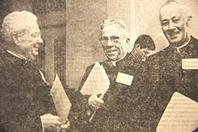 During a break in the busy schedule of last week’s meeting of U.S. Bishops at Chicago, Bishop John J. Scanlan, auxiliary of Honolulu (right) chats with Bishop George Leech of Harrisburg (left) and Bishop William Condon of Great Falls (center). Bishop Scanlan is currently on a tour of major seminaries to invite future priests to work in the Diocese of Honolulu. The tour will keep Bishop Scanlan away from Hawaii for a possible three months.