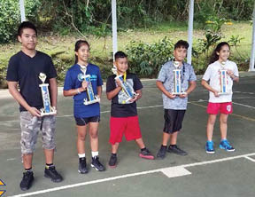 Five boys and girls, ages 9 to 14, from St. Ann Church, Kaneohe, and Sacred Heart Church, Waianae, were the winners of the Knights of Columbus Hawaii State Council Free Throw Championships April 8 at St. Stephen Diocesan Center, Kaneohe. Tayden Poti of Council 11485, Waianae, was the 9-year-old boys’ champion. Kawena Kapu of Council 14620, Kaneohe, was the 11-year-old girls’ champion. Tatum Poti of Council 11485 was the 11-year-old boys’ division winner. The 12-year-old girls’ division was won by Rylee Ramirez of Council 14620 and the 13-year-old boys’ division winner was Pryor B. “PJ” Abraham Jr. of Council 11485. Each contestant was allowed 25 free throw attempts. The winners move on to the international level. Pictured, from left, are Pryor B. “PJ” Abraham Jr., Rylee Ramirez, Tayden Poti, Tatum Poti and Kawena Kapu. (Photo courtesy of the Knights of Columbus)