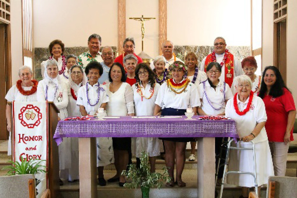 At a commitment ceremony held at Regina Pacis Convent Chapel in Kaimuki, April 9, Sacred Hearts Sister Anne Marie Tamanaha, front right, religious mentor of her congregation’s Secular Branch Community of Associates, testified to their zeal in living the spirituality of the Congregation of the Sacred Hearts. The Community of Associates was the first group of Sacred Hearts laity in Hawaii originating from the congregation’s exterior association. Throughout the years members have supported numerous charities and the Sacred Hearts missions in India, Africa, Philippines and Fiji, where the congregation’s seminarians study. (Photo courtesy of the Sacred Hearts Secular Branch )
