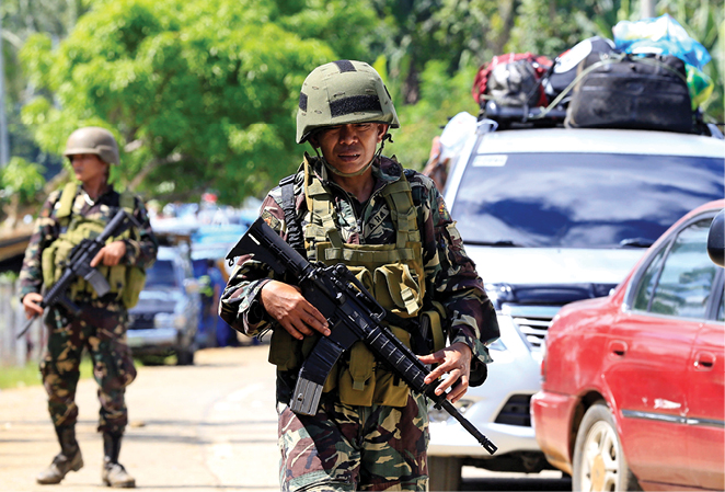 Philippine government troops stand guard May 24 at a checkpoint along a main highway in Lanao del Norte province. (CNS photo/Romeo Ranoco, Reuters)