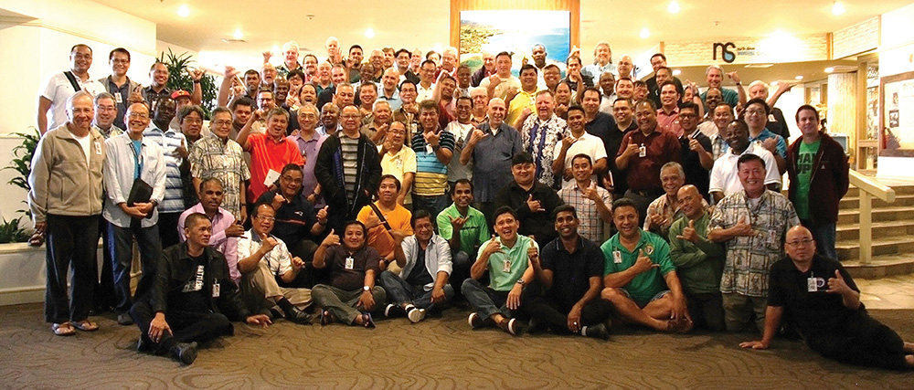 Island priests share smiles and shaka at the lobby of Turtle Bay Resort in Kahuku, May 18, during a break in the annual Priests’ Convocation. The weeklong convocation provided local clergy with opportunities for prayer, fellowship, leisure and learning. This year’s convocation theme was “Witness to Jesus: Go and Make Disciples of All Nations.” Among the activities at the gathering were sessions with visiting speakers theologian Ralph Martin and well-known stewardship advocate Father Andrew Kemberling. (HCH photo | Darlene Dela Cruz)