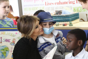Melania Trump, wife of U.S. President Donald Trump, hugs a patient at Bambino Gesu Hospital in Rome. (CNS photo/Evandro Inetti, pool)