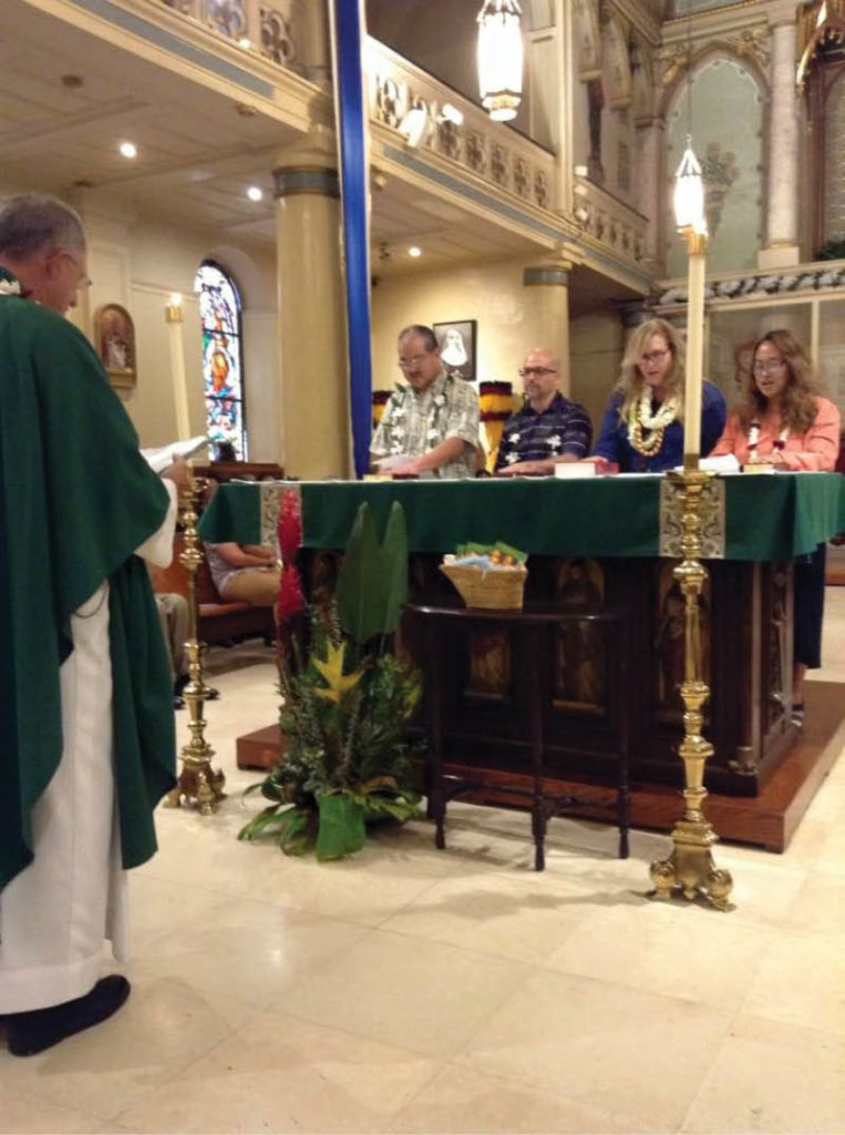 From left, David Suzuki, Preston Medeiros, Monica Cobb-Adams and Easter Almuena make their pledge as Pauline Cooperators with presider Msgr. Gary Secor at the Cathedral Basilica of Our Lady of Peace, Sept. 4, 2016. (Courtesy photo)