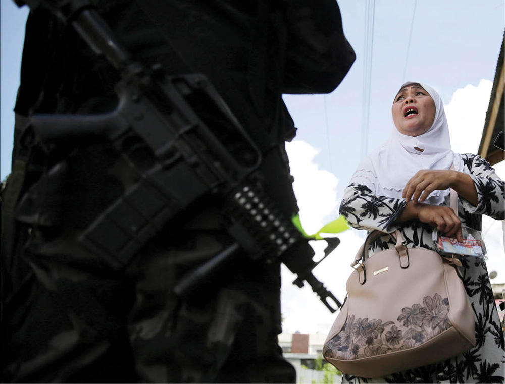 A Filipino woman speaks to a soldier at a checkpoint in Marawi, Philippines, June 1. People started to evacuate the town after President Rodrigo Duterte imposed martial law across the entire Muslim-majority region of Mindanao. (CNS photo/Francis R. Malasig, EPA)