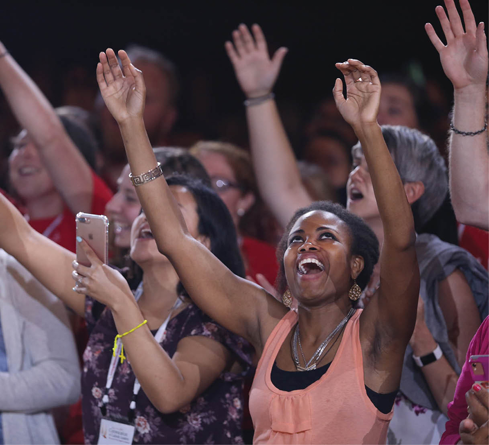 Young people lift their arms in prayer as Catholic musician Matt Maher performs July 3 during the “Convocation of Catholic Leaders: The Joy of the Gospel in America” in Orlando, Fla. Leaders from dioceses and various Catholic organizations gathered for the July 1-4 convocation. (CNS photo/Bob Roller)
