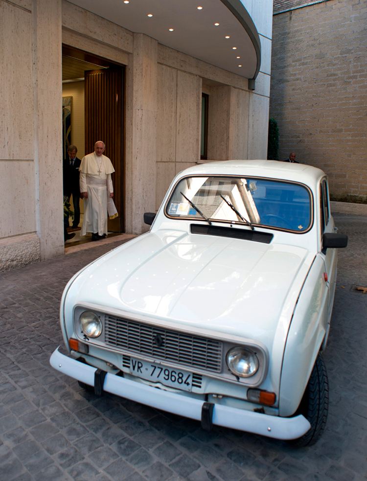 A white 1984 Renault that Father Renzo Zocca donated to Pope Francis in 2013. The Italian priest put more than 180,000 miles on the car, ministering to drug addicts and the poor. Pope Francis said he had the same make and model when he worked in Buenos Aires, Argentina, and it “never let him down.” (CNS photo/L’Osservatore Romano via Catholic Press Photo)