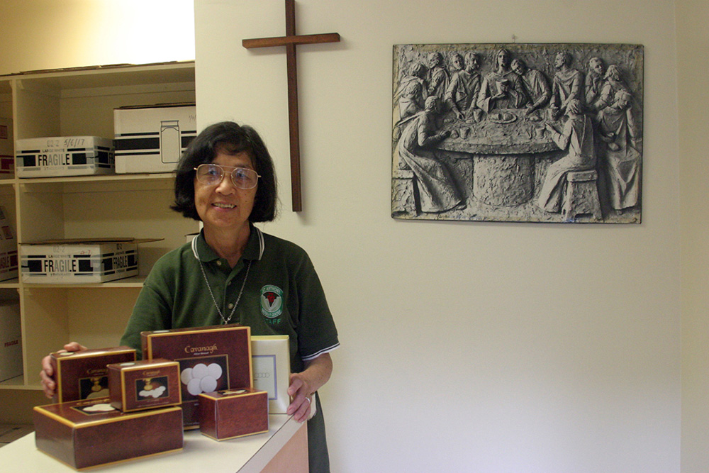Sacred Hearts Sister Ivy Yim July 19 shows some of the boxes of hosts she distributes from a small building on the grounds of St. Anthony Retreat Center in Kalihi. Behind her on the wall is a depiction of the Last Supper. (HCH photo | Patrick Downes)