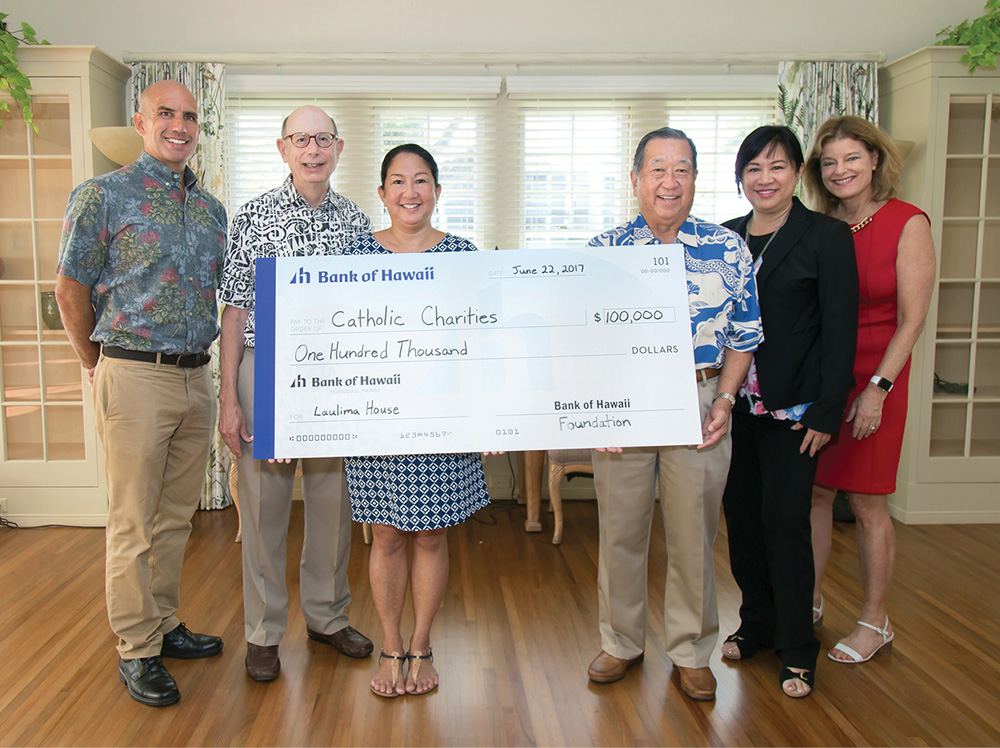 The Bank of Hawaii Foundation this month gave Catholic Charities Hawaii a pledge of $100,000 for its campaign to expand services for children and families at its Laulima House residence on Keeaumoku Street next to the Catholic Charities campus in Honolulu. Pictured, from left, are Catholic Charities president and CEO Terry Walsh, Laulima House campaign chairman Jerry Rauckhorst and Catholic Charities vice president-philanthropy Mary Leong Saunders, Bank of Hawaii vice chairman Alton Kuioka, BOH senior executive vice president Susan Ing, and BOH senior vice president Bonnie Fong. Laulima, in Hawaiian, means “many hands working together.” (Photo courtesy of Catholic Charities Hawaii)