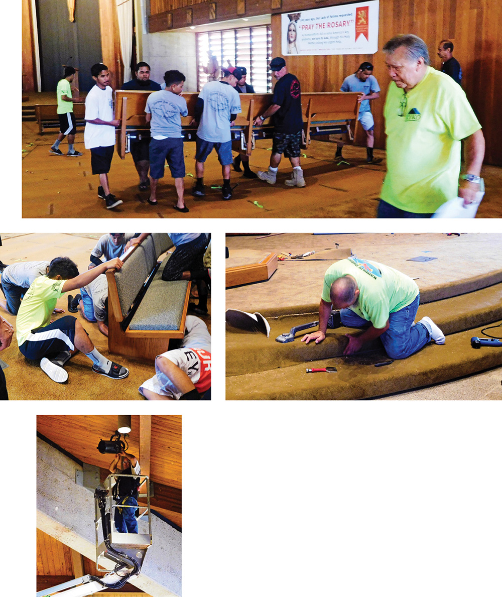 Recarpeting a church can be a chore, considering all those pews. But at St. Anthony Church in Wailuku, Maui, what had been expected to take two weeks took only one thanks to the volunteer efforts of many, the organizational skill of Gil Hoopii (pictured top, right), and nearly two dozen Jobs Corps members recruited by Kathy Shimada. On June 26, the pews were moved in about an hour instead of the expected two days. Workers from Kahului Carpet tore out the old carpet and replaced it with new carpeting in just over three days. With the pews temporarily gone, a “cherry picker” was brought in to replace faulty ceiling lights. The pews were then returned to their places with equal dispatch. (Photos courtesy of Marianist Brother Fred Silbereis)