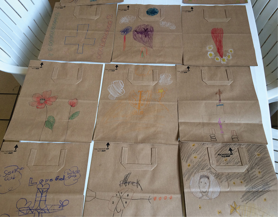 Paper bags to be filled with food are first decorated with cheerful greetings by the parish religious education students.