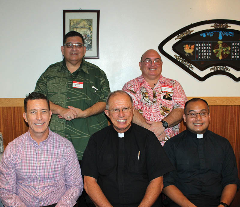 The Serra Club of Honolulu hosted the diocesan seminarians on Oahu at a luncheon at the New Empress Restaurant in Chinatown before they headed back to school. Pictured standing are William “Pila” Tulua and Kevin Clark. Seated is Clifford “Chance” Billmeyer, Serra chaplain Msgr. Gary Secor and diocesan vocations director Father Rheo Ofalsa. Also at the luncheon but unavailable for the picture was seminarian Romple Emwalu. Founded in 1970, the Serra Club of Honolulu is part of a worldwide Catholic organization of lay men and women dedicated to promoting vocations to the priesthood, diaconate and vowed religious life. For information about Serra, contact Jack Kampfer at 621-0852. (Photo courtesy of the Serra Club of Honolulu)