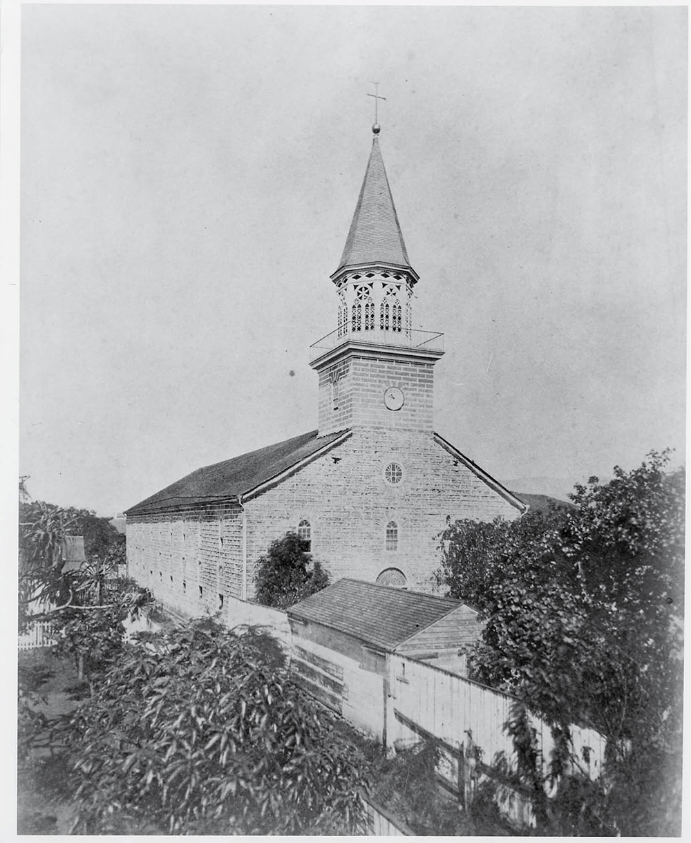 This circa 1867 photo of Honolulu’s Cathedral of Our Lady of Peace shows the coral blocks that make up its walls. (HCH file photo)