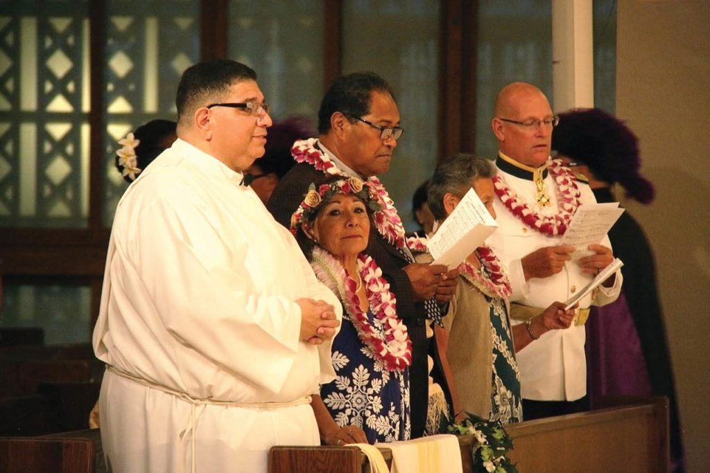 Then, in one of the more moving parts of the rite, Tulua laid prostrate, face down, on a lauhala mat as the cantor led the congregation in the Litany of Supplication, asking a lengthy list of saints to “pray for us.”