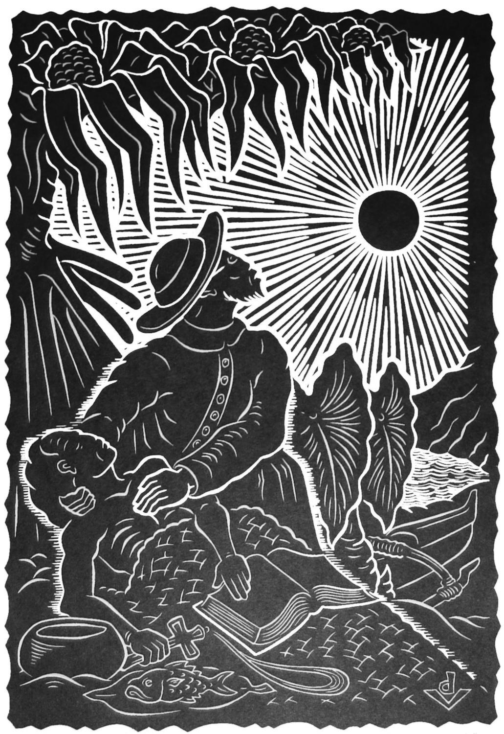 Artwork by Big Island artist Dietrich Varez depicts St. Damien De Veuster aiding Hansen’s disease patients.