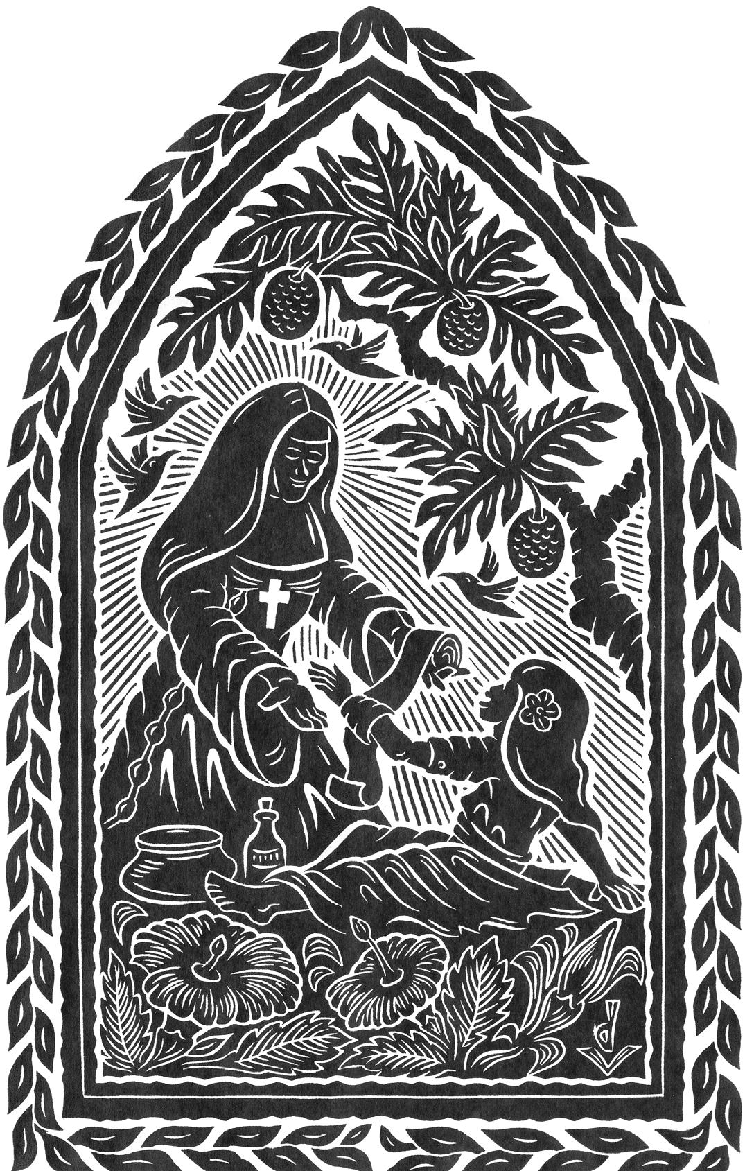 Artwork by Big Island artist Dietrich Varez depicts St. Marianne Cope aiding Hansen’s disease patients.