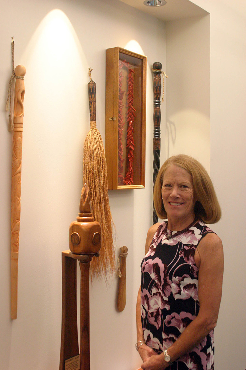 Chaminade University president Lynn Babington stands next to a display of cultural and academic artifacts outside her office on the Chaminade campus Sept. 7. She is the Catholic university’s 10th president.
