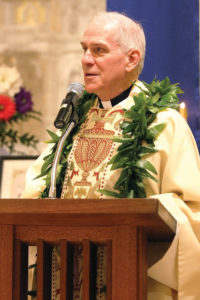 Marianist Father Martin Solma gave the homily. The superior of the order’s U.S. province, visiting the Islands, explained the Marianists’ history in Hawaii, from the arrival of the first missionaries in Honolulu Harbor in 1883, to their expansion to St. Anthony parish and school in Wailuku and to the Big Island.