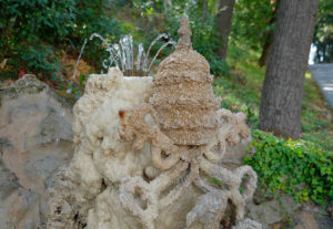 The dome of St. Peter’s Basilica is seen through trees in the Vatican Gardens Oct. 3. The Vatican is involved in a five-year project to develop ecologically friendly cleaning agents and techniques to clean, restore and maintain the 570 works of art, including fountains, statues and stone plaques, on display outside. Below, a fountain with papal symbols is seen in the Vatican Gardens Oct. 3. (CNS photos/Paul Haring)