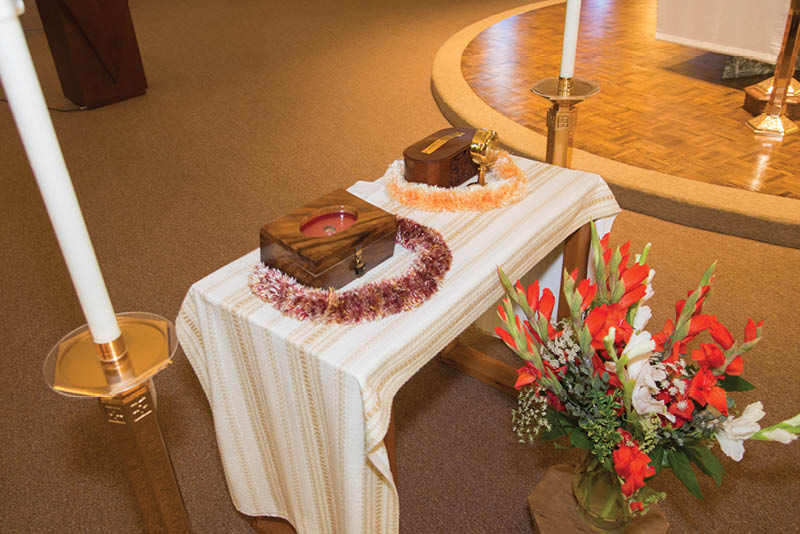 During the ceremony, which included hymns, Scripture readings and petitions, Tulua and Father Brad Krawczek, director of liturgy at the seminary, held the two reliquaries for the people to come forward and touch and kiss them. After the formal service, the relics were placed on a small table, encircled by ribbon leis, for a hour more of further veneration.