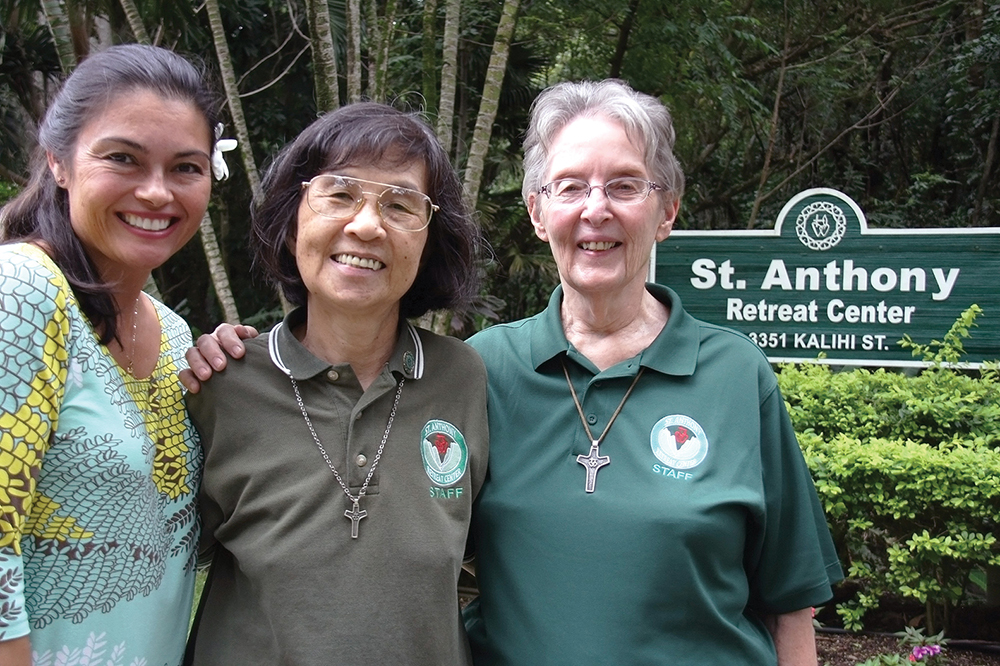 The retreat ministry team and staff of St. Anthony Retreat Center in Kalihi Valley are eager to serve the community’s spiritual needs. From left to right are Malulani Kamanu, Sacred Hearts Sister Ivy Yim and Sacred Hearts Sister Marie Lemert.