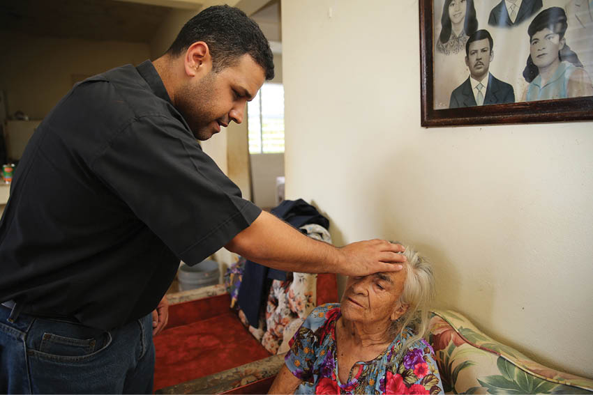 Father Carlos Francis Mendez, pastor of Immaculate Heart of Mary Church in Las Marias, Puerto Rico, blesses Luz Lamboy, 82, who has Alzheimer’s and lives alone, at her home in a remote area outside the town Oct. 24. Father Mendez and parishioners distributed relief goods to her home and others in the poor area outside the town who were affected by Hurricane Maria. (CNS photo/Bob Roller)