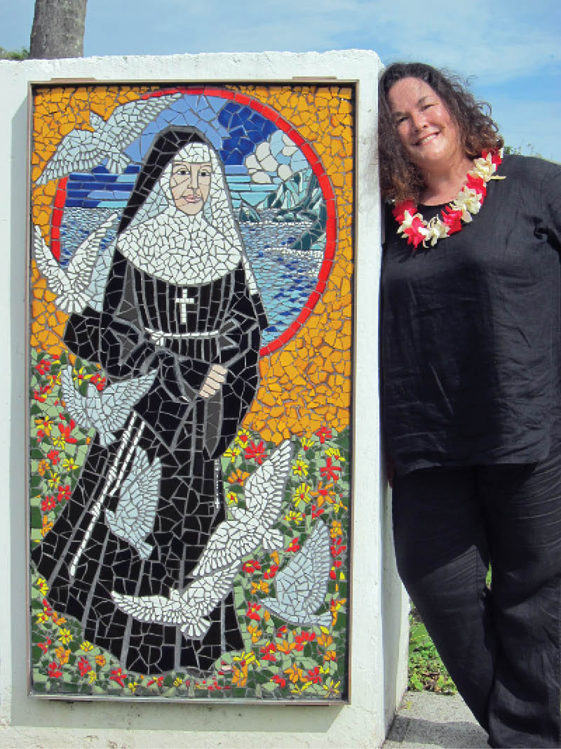 Kate Mahoney poses by a mosaic of St. Marianne Cope on the grounds of St. Francis Church, Kalaupapa,. Molokai, Oct. 23. (Photo courtesy of Sister Malia Dominica Wong)