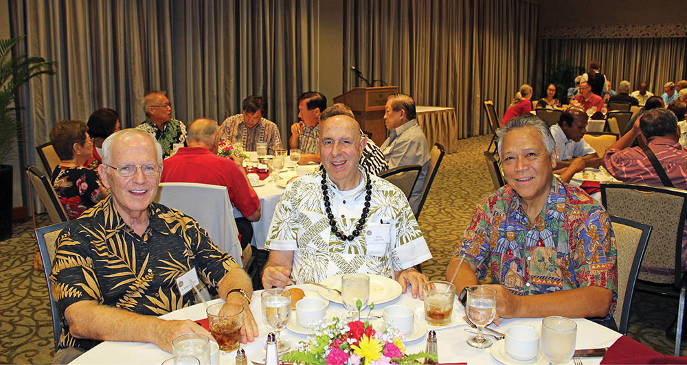 Among the 30 priests enjoying the Serra Club of Honolulu’s recent annual priest appreciation dinner at the Hale Koa Hotel were, from left, retired Father William Shannon, Bishop Larry Silva and Sacred Hearts Father Lane Akiona, pastor of St. Augustine Parish in Waikiki. Founded in 1970, Honolulu’s Serra Club is part of a worldwide Catholic organization of lay men and women who promote vocations to the priesthood, diaconate and religious life. For further information on Serra, call Jack Kampfer at 621-0852. (Photo courtesy of Jack Kampfer)