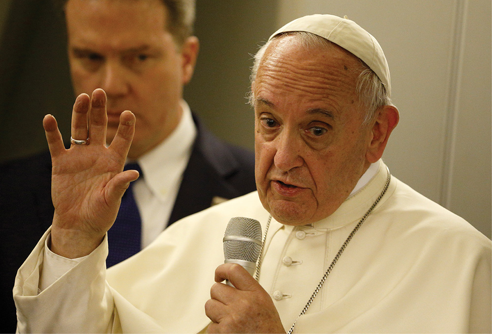 Pope Francis answers questions from journalists aboard his flight from Dhaka, Bangladesh, to Rome Dec. 2. (CNS photo/Paul Haring)