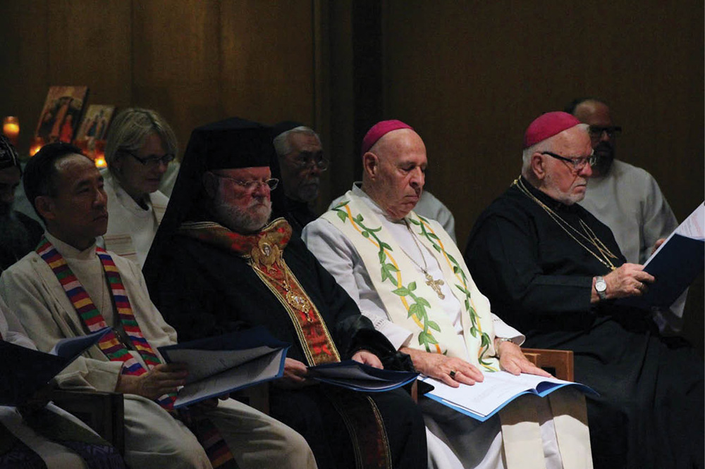 Bishop Larry Silva, third from left, sits among Hawaii Christian leaders at the Newman Center in the 2017 prayer service for Christian unity.