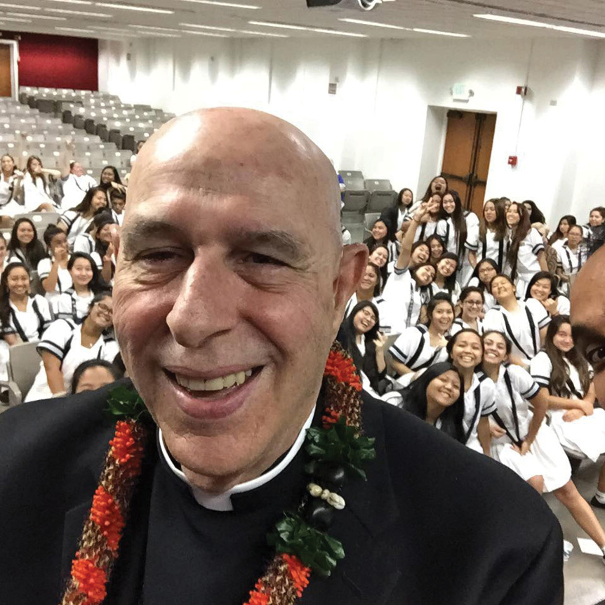 Bagels with Bishop is a name of the encounter the leader of Hawaii’s Catholic Church has with a Catholic high school senior class over a light breakfast with a side of conversation, questions, answers, advice, prayer and souvenir selfies with the main man, Bishop Larry Silva. Bagels optional.