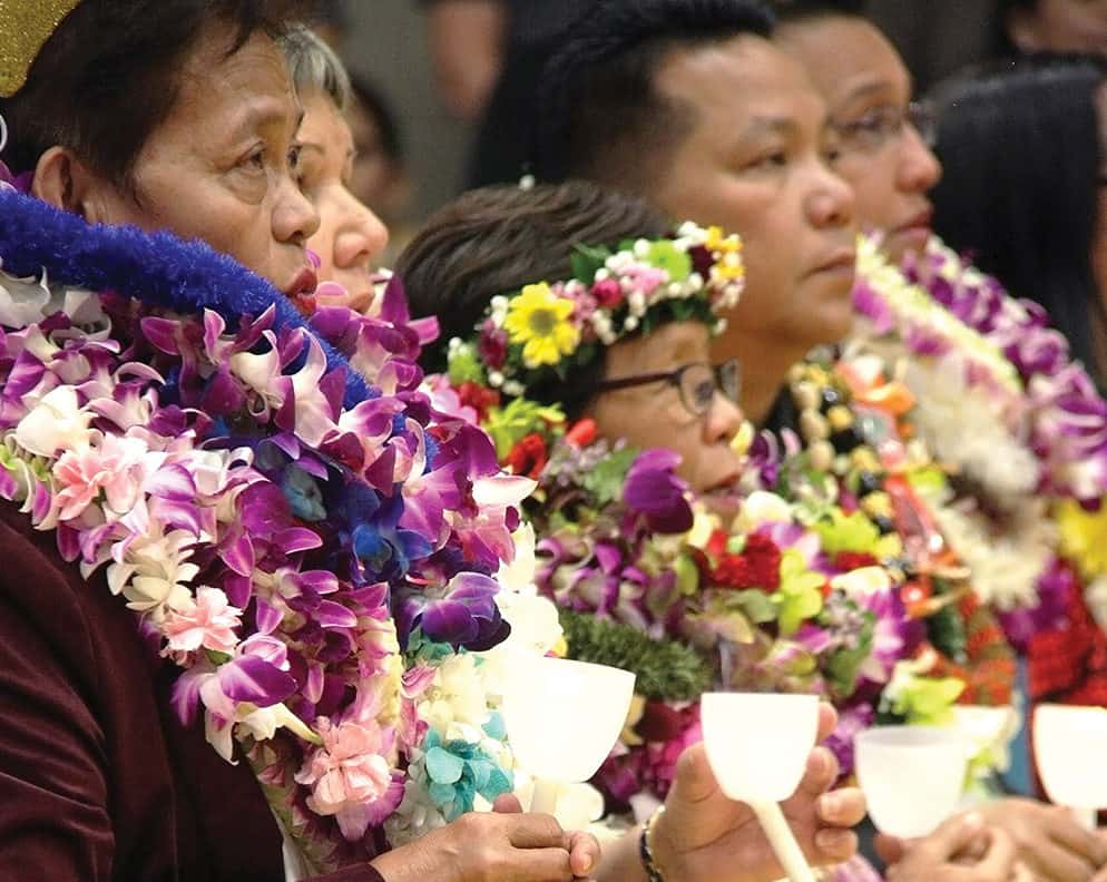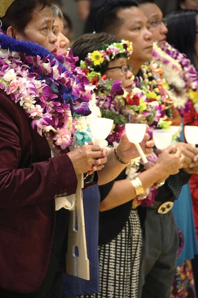At the Annual Conference for Catholic Educators Feb. 2 in Honolulu, teachers and staff decked in lei celebrate their milestone anniversaries of 20 and 30 years serving in Catholic education. The conference, which hosted several hundred Catholic school faculty members at Sacred Hearts Academy, began with a morning Mass that also marked the Feast of the Presentation of the Lord or “Candlemas” day. Here, teachers hold candles as part of the opening procession for the liturgy. The Annual Conference for Catholic Educators caps off National Catholic Schools Week, this year celebrated Jan. 28-Feb. 3. (HCH photo | Darlene J.M. Dela Cruz)