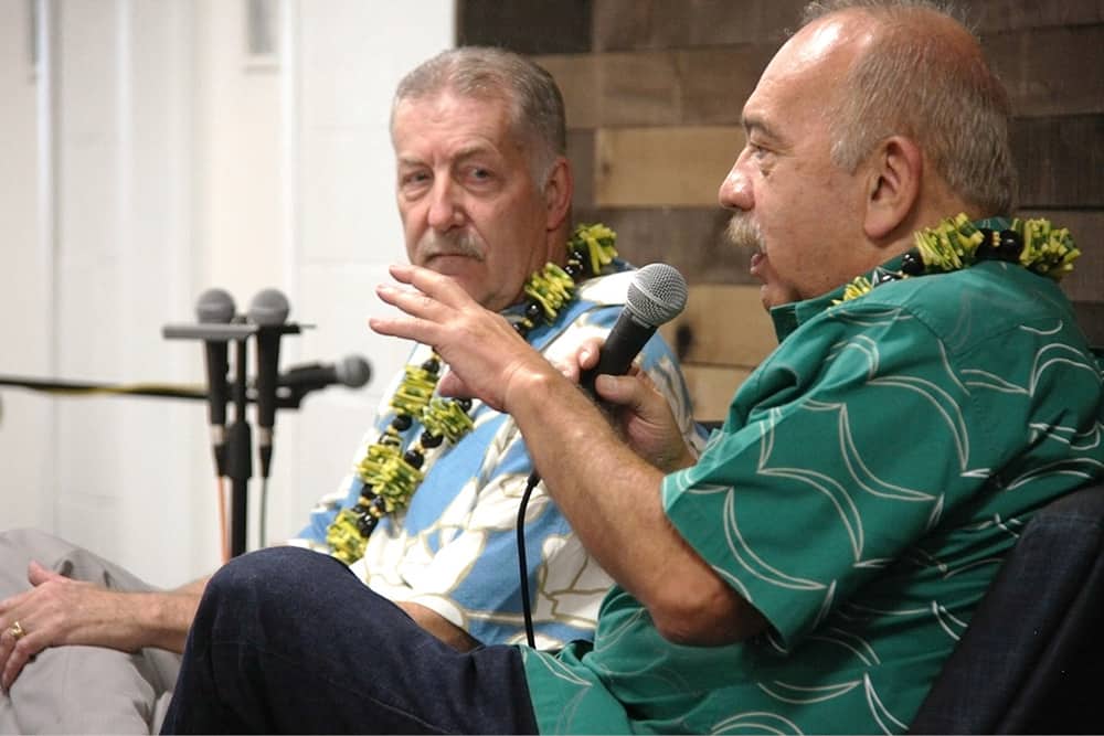 Former Hawaii Governor John Waihee and former Honolulu Mayor Peter Carlisle talk about civics and faith at Holy Family Catholic Academy in Honolulu, Jan. 24. The discussion was aimed at highlighting for 7th and 8th grade students at Holy Family the importance of public service in light of Christian values and principles. (HCH photo | Darlene Dela Cruz)
