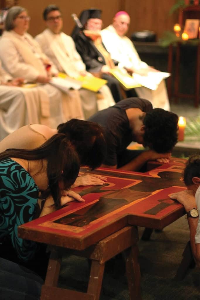 Bishop Larry Silva and leaders of local Christian churches look on as participants venerate a wooden iconographic cross at the Jan. 25 ecumenical Taize prayer service at the Newman Center. The Taize evening ceremony was held at the University of Hawaii at Manoa parish and Catholic campus ministry hub as part of the annual Week of Prayer for Christian Unity. (HCH photo | Darlene Dela Cruz)