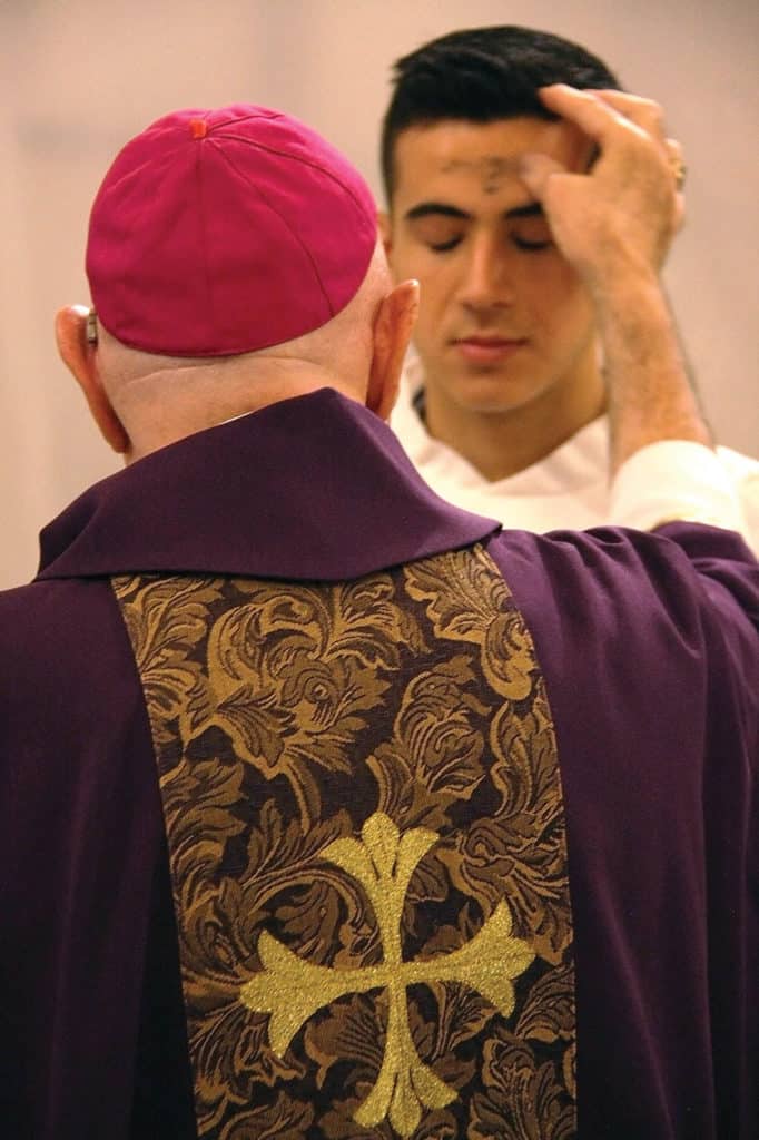 The marking of ashes on the foreheads of Catholic faithful signals the start of the penitential season of Lent, which this year began on Ash Wednesday, Feb. 14, and culminates with the Easter Triduum, Holy Thursday through Easter Sunday, March 30-April 1. Bishop Larry Silva, shown here in purple liturgical vestments traditional for Lent, celebrated Ash Wednesday Mass at the Cathedral Basilica of Our Lady of Peace and distributed ashes to parishioners there.