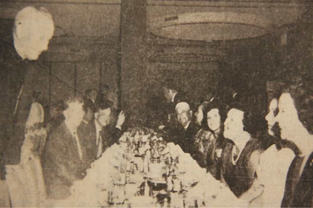 Bishop Scanlan leans over the table to speak to some of the guests at the annual “Meet the Bishop” banquet held on Monday at the Ala Moana Banquet Hall. It is sponsored yearly by the Oahu Council of the Holy Name Societies.