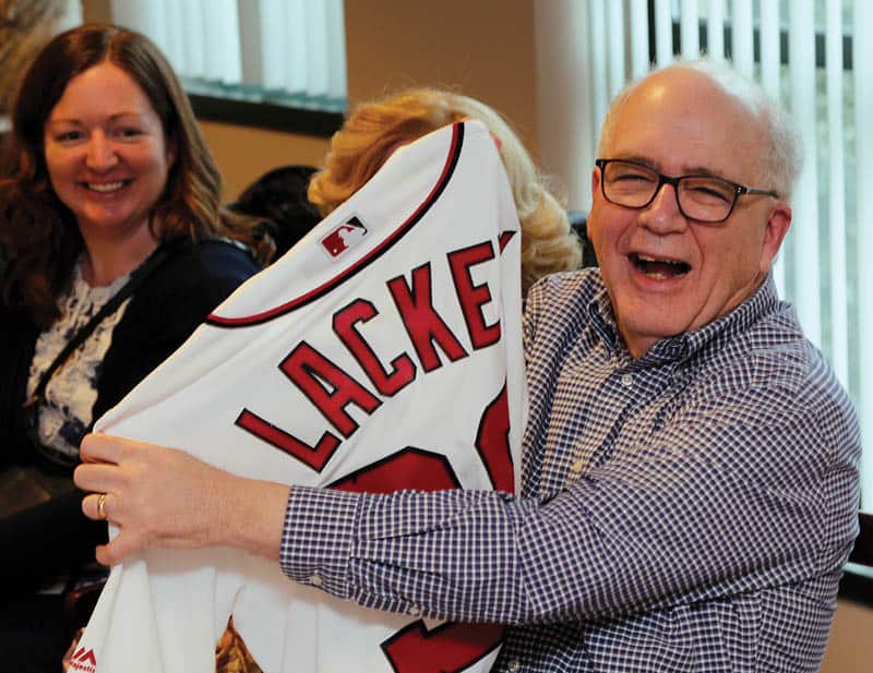 Jim Lackey, longtime editor at Catholic News Service, holds up a Washington Nationals baseball jersey during his retirement party Feb. 13 in Washington. Looking on at left is his daughter, Katharine. (CNS photo/Bob Roller)