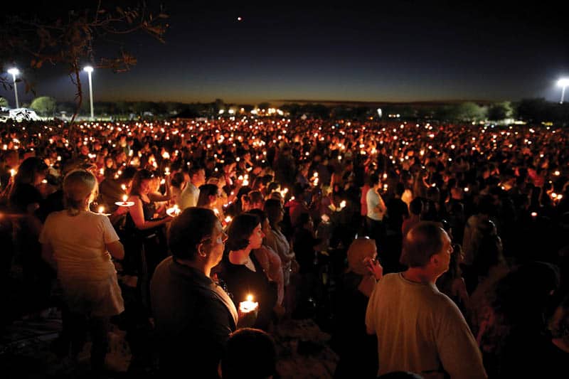 Thousands of mourners remembered the victims at a candlelight vigil held near the high school the evening of Feb. 15. Still others attended a prayer service at Mary Help of Christians Catholic Church in Parkland.