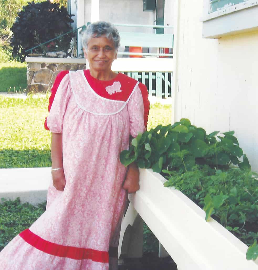 Elizabeth Kahihikolo poses near a window box of flowers she planted several years ago at her home in Kalaupapa. (Photo courtesy of Valerie Monson)