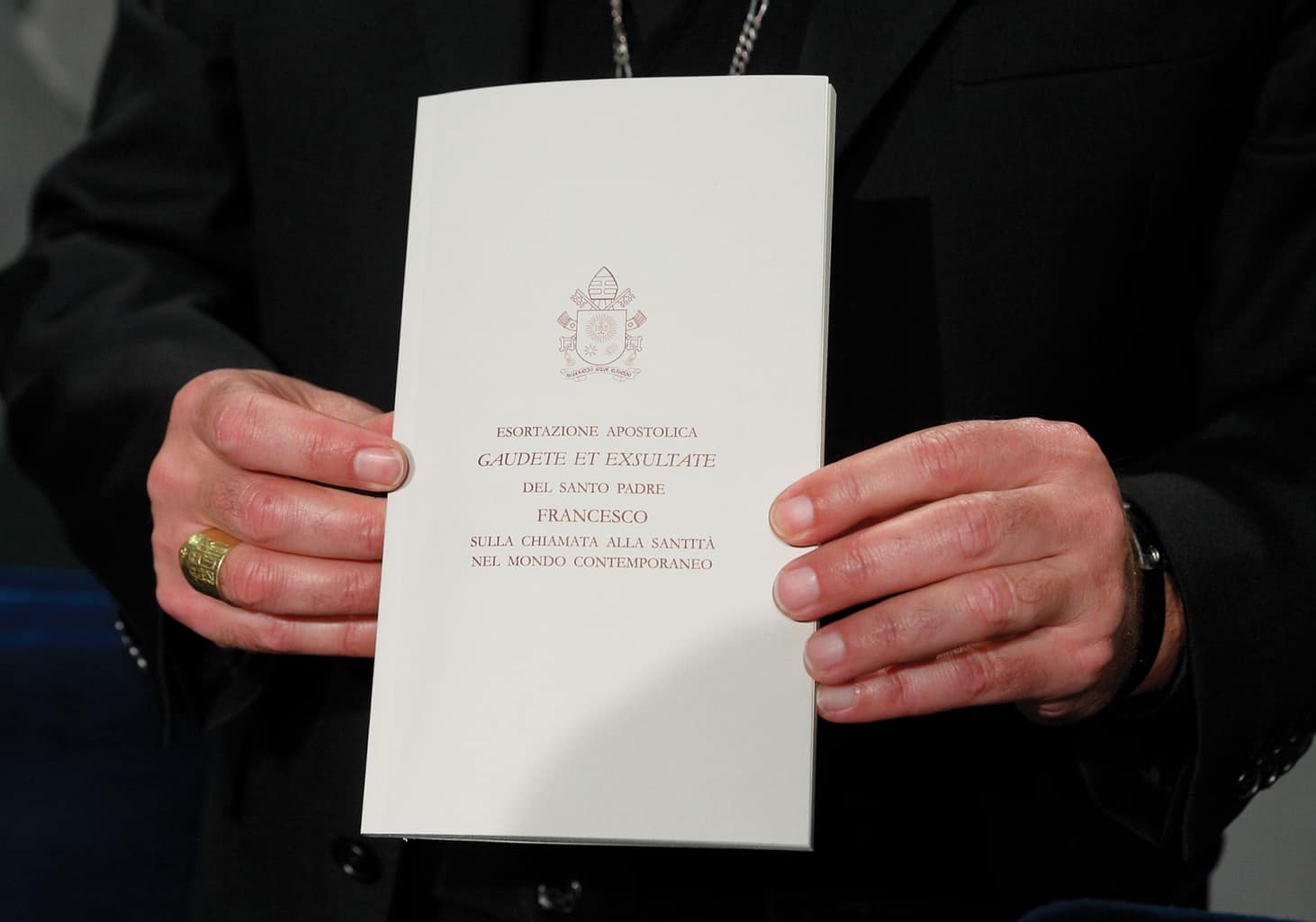 Archbishop Angelo De Donatis, papal vicar for the Diocese of Rome, holds a copy of Pope Francis’ exhortation, “Gaudete et Exsultate” (“Rejoice and Be Glad”), during a news conference on the exhortation at the Vatican April 9. The document is on the “call to holiness in today’s world.” (CNS photo/Paul Haring)
