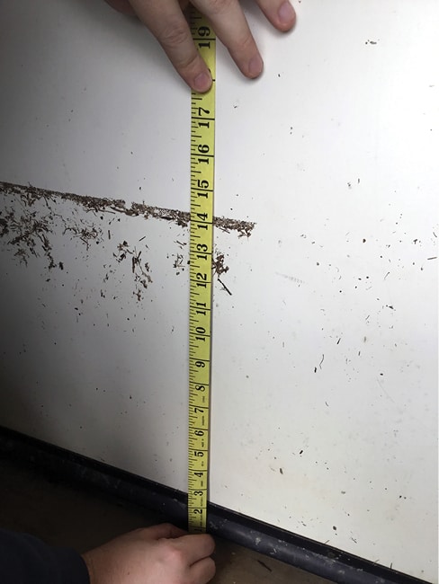 Left, a high water mark of just over 14 inches shows how high the flood water level rose in the church. (Photo courtesy of St. Catherine Parish)