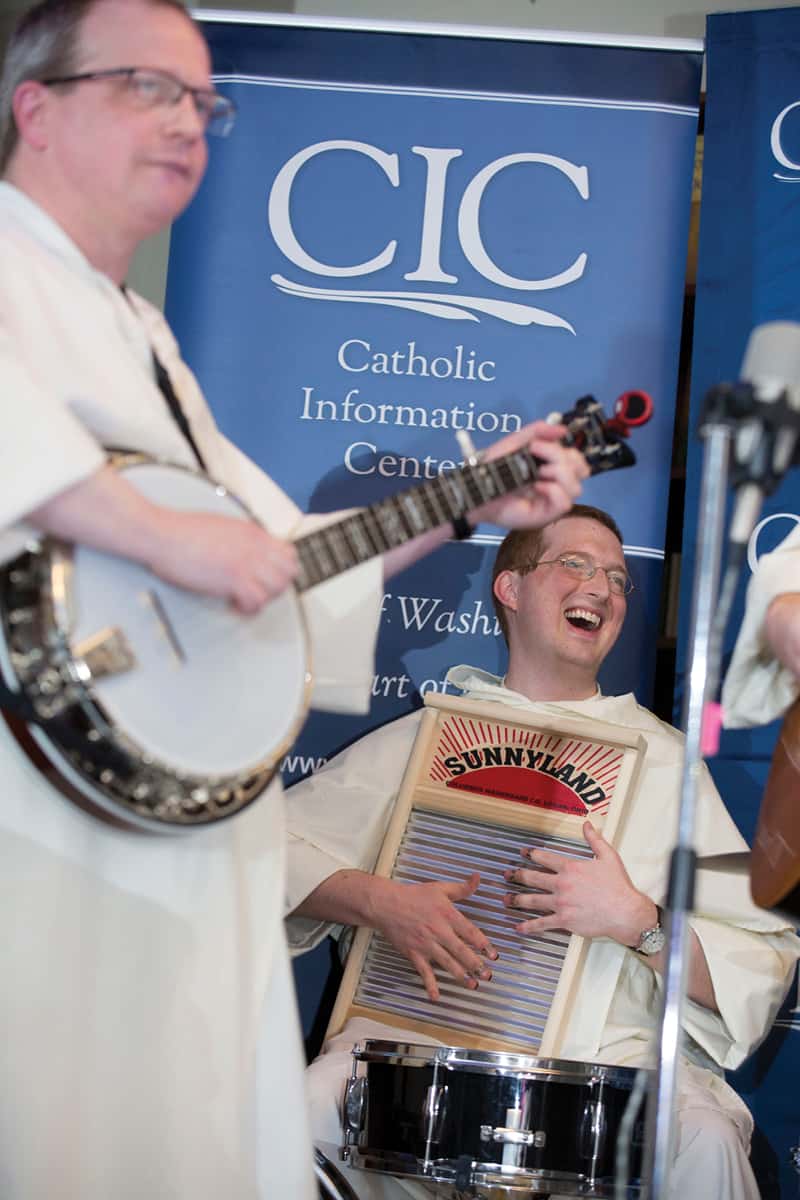 Dominican Brother Joseph Hagan smiles as he plays the washboard during an April 11 performance by the Hillbilly Thomists at the Catholic Information Center in Washington. At left is Dominican Father Thomas Joseph White, one of the founding members of the band, consisting of 10 Dominican friars from the Dominican House of Studies in Washington. (CNS photo/Jaclyn Lippelmann, Catholic Standard)