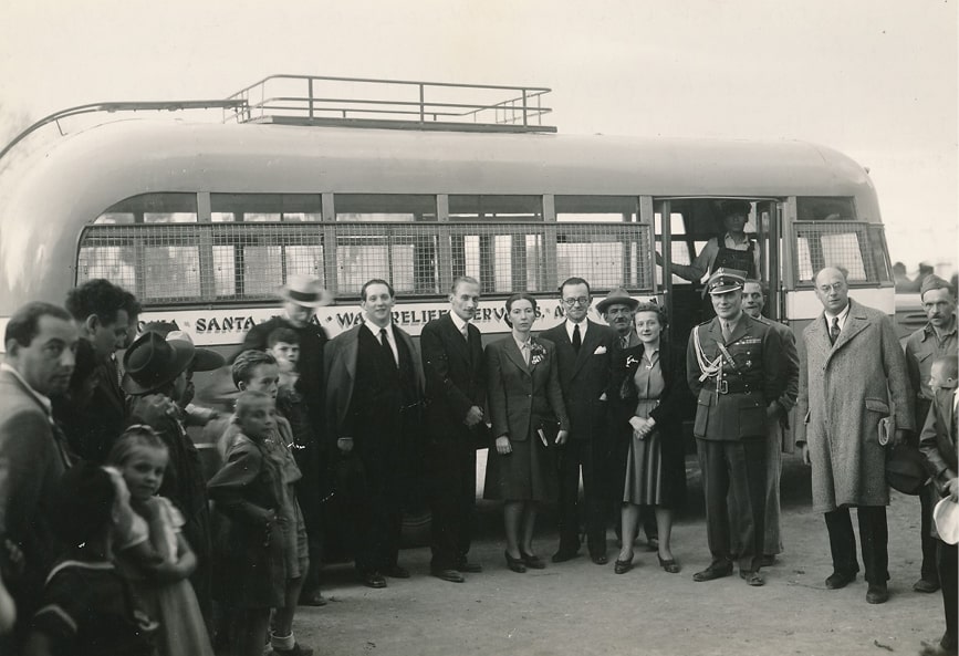 Polish displaced persons released from Siberian labor camps and arriving in Mexico stand next to a National Catholic Welfare Conference’s war relief services bus sometime near the end of World War II. Eileen Egan is center. (CNS file photo)
